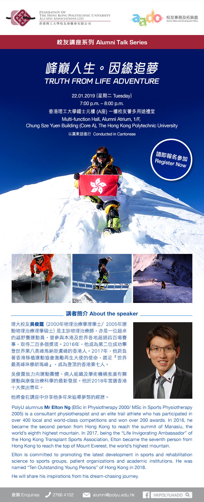 You are cordially invited to join the upcoming alumni talk to be held on 22 January 2019. Mr Elton Ng, our PolyU alumnus and a consultant physiotherapist, will share his dream-chasing journey. He is the seventh person from Hong Kong to reach the top of Mount Everest, the world’s highest mountain.